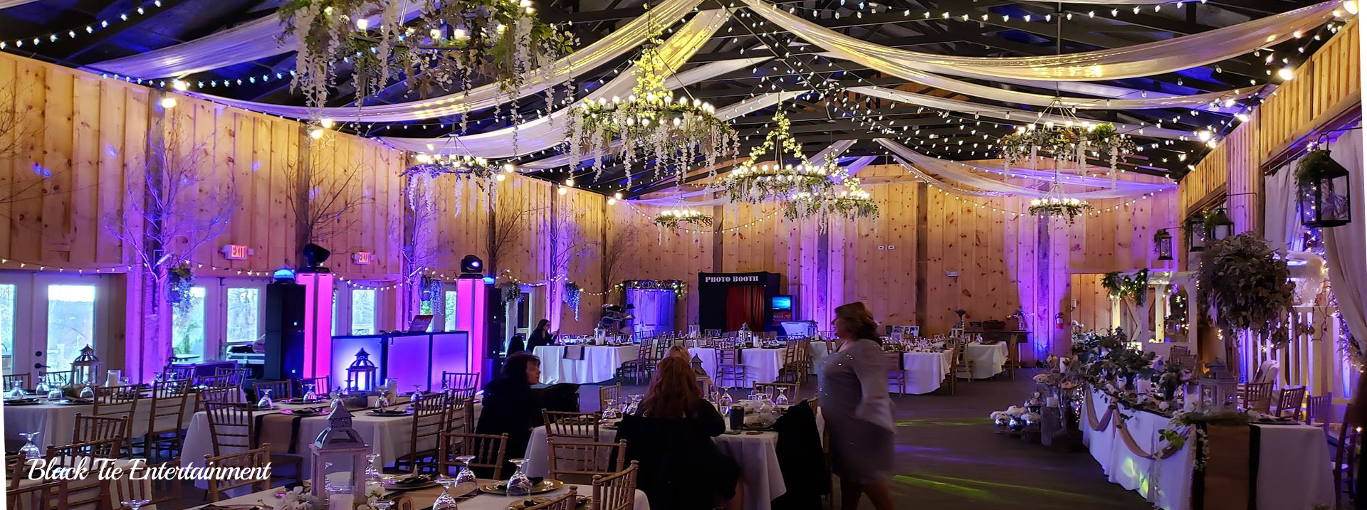 Black Tie Entertainment can accent the woodwork at The Barn on Enchanted Acres by placing 20 LED Up-Lights around the perimeter of the room shining up on the walls. Our intelligent LED lights are controlled wirelessly by our computerized lighting software. We can set them to any color you like.